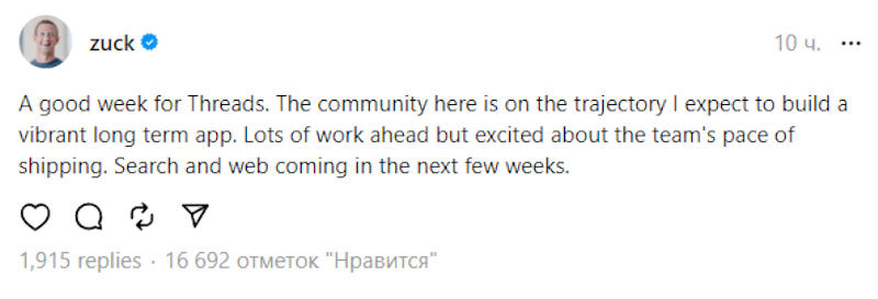 «Tópicos teve uma boa semana. A comunidade está em uma trajetória que eu esperava para criar um aplicativo vibrante de longo prazo. Há muito a ser feito, e estou encantado com o ritmo de trabalho da equipe. A busca e a versão web estarão disponíveis nas próximas semanas”, escreveu o CEO da Meta✴ na plataforma.