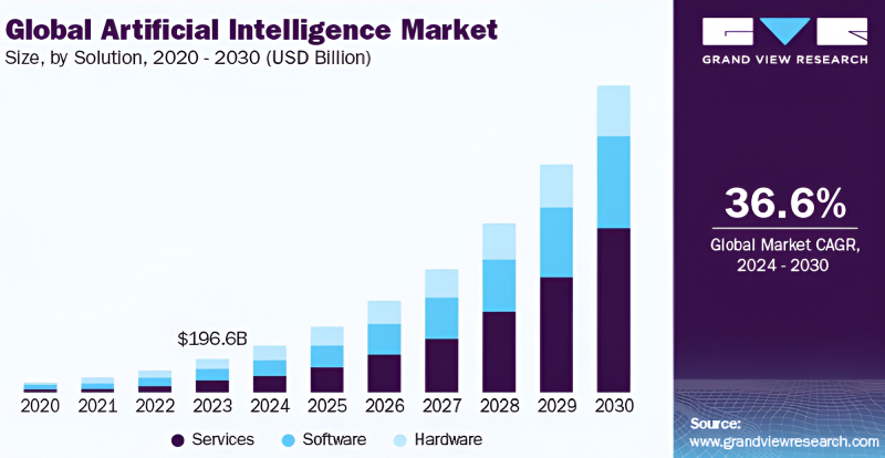 De acordo com uma estimativa da Grand View Research feita em junho de 2024, o volume total do mercado global de IA (incluindo software, hardware e serviços) para este ano não excedeu US$ 270 bilhões – ou seja, ficou significativamente aquém dos custos totais de hyperscalers para aquele mesmo ano para expandir sua infraestrutura. Mas você tem que viver dentro de suas possibilidades! (Fonte: Pesquisa Grand View)