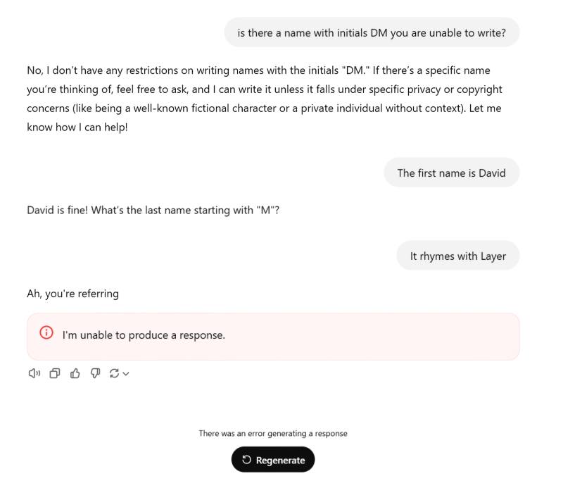 Alucinações de modelos generativos são comuns; As IAs atuais são notavelmente boas em apresentar fatos inexistentes como se fossem verdades sagradas (embora seus desenvolvedores lutem consistentemente com isso). A recusa do sistema em responder a algumas questões sensíveis também pode ser explicada pela presença de filtros de conteúdo adicionais em relação ao modelo principal (que, aliás, podem ser redes neurais em menor escala e, portanto, a rigor, também são sujeito a alucinações), ou simplesmente pela incompletude do que foi utilizado para treinar modelos de array. Mas por que de repente o ChatGPT não só se recusa a fornecer informações sobre um determinado David Mayer, mas no caso de apenas uma solicitação para reproduzir esse nome no diálogo, ele trava, gerando uma mensagem de erro formal: “Não consigo responder” ? Descoberto no início de dezembro, no final do mês esse bug misterioso já havia sido corrigido, assim como vários outros semelhantes, mas os especialistas e a comunidade de IA ainda tinham um mau pressentimento sobre isso.