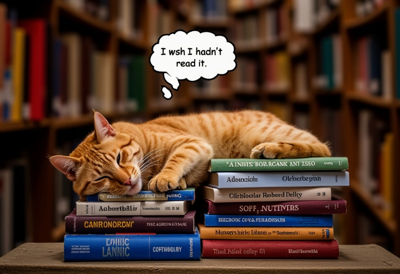 Treinado em uma pilha de livros que se tornaram de domínio público e ali deitado (fonte: geração de IA baseada no modelo FLUX.1)