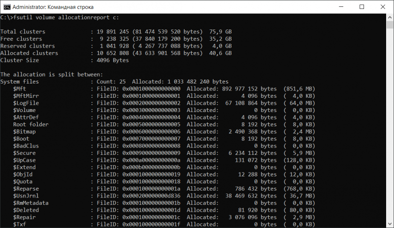 Fsutil. Uma ferramenta de console para visualizar informações sobre os sistemas de arquivos usados em um disco de PC, avaliando rapidamente o espaço ocupado na unidade e identificando áreas problemáticas, criando links físicos para arquivos, gerenciando cotas de disco e resolvendo outras tarefas. Por exemplo, o comando fsutil fsinfo volumeinfo c: exibe informações sobre o disco do sistema e os volumes envolvidos, e o fsutil volumelocationreport c: permite descobrir quanto espaço é usado pelos arquivos de serviço e metadados do sistema de arquivos NTFS, cópias de sombra do Windows (restaurar pontos), arquivos compactados, criptografados e esparsos.