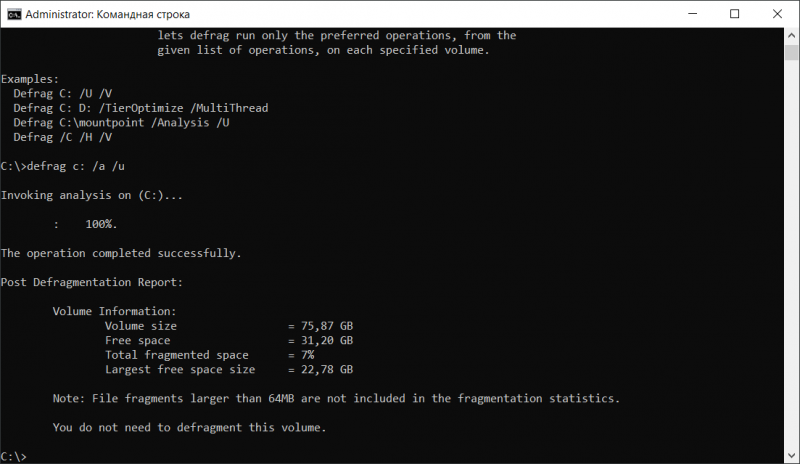 Desfragmentar Um utilitário para desfragmentar discos rígidos. O programa organiza e combina dados fragmentados, aumentando assim a eficiência do HDD (para unidades SSD de estado sólido, o problema de fragmentação de arquivos é irrelevante). A desfragmentação permite otimizar todos os dados no disco e apenas os arquivos de inicialização. Suporta o trabalho com seções individuais, diferentes prioridades do sistema e em segundo plano. Antes de usar o aplicativo, é recomendável avaliar a necessidade de desfragmentar um determinado disco. Isso é feito usando a opção /a, que inicia a análise do volume especificado.