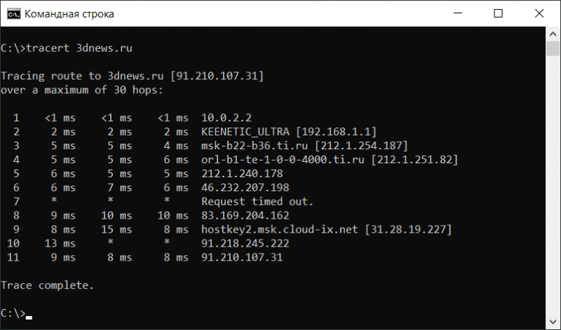Tracert. Aplicativo de console para rastrear uma rota para um determinado servidor na Internet. O programa envia um pacote de teste para o host especificado e exibe informações sobre todos os roteadores intermediários pelos quais o pacote passou a caminho do recurso solicitado, bem como o tempo de resposta de cada um deles. Isso permite avaliar quanto “longo” o caminho o pacote percorreu e em qual seção ocorrem os maiores atrasos associados à transferência de dados. O Tracert ajuda você a identificar áreas problemáticas em sua rede e identificar onde os pacotes são perdidos ou atrasados.