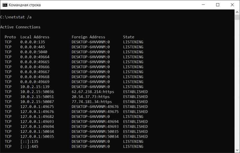 Netstat. Usado para obter informações sobre todas as conexões de rede ativas, visualizar tabelas de roteamento IP e estatísticas de protocolo. Usando o comando netstat, você pode ter uma ideia de qual software instalado no computador mostra atividade de rede excessiva, qual porta um determinado processo do sistema usa e também visualizar informações estendidas sobre interfaces de rede.