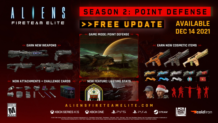 Além disso, o Point Defense adicionará ao Aliens: Fireteam Elite a função de visualizar as estatísticas do usuário para uma série de parâmetros, mais quatro tipos de armas, itens cosméticos adicionais, modificações e cartas de desafio.
