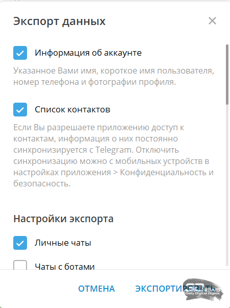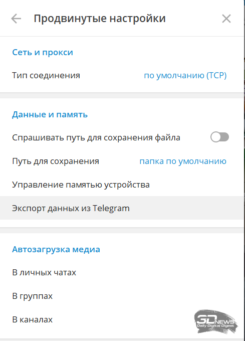 Também no Telegram, você pode salvar dados de chats ou canais individuais. Para fazer isso, na janela do canal, clique nos três pontos no canto superior direito e selecione “Exportar histórico de bate-papo” e especifique quais dados salvar.