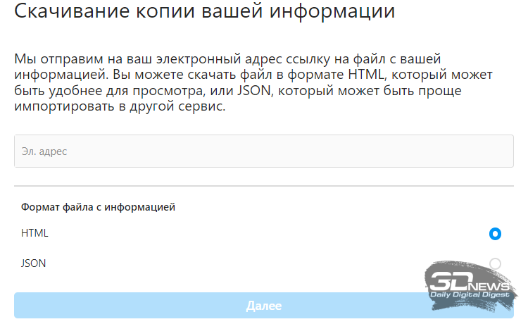 Em seguida, você precisa especificar o endereço de e-mail para o qual todas as fotos, vídeos, histórias e correspondências do seu perfil serão enviadas. O processamento da solicitação leva até 48 horas.