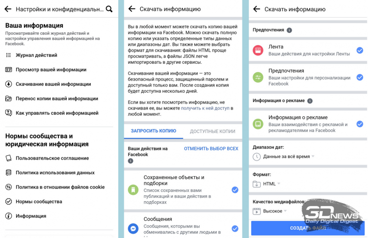 Em seguida, você será solicitado a selecionar quais dados deseja baixar, bem como especificar o intervalo de datas desejado, o formato de dados e a qualidade da mídia. Em seguida, a plataforma criará o arquivo e, quando estiver pronto, enviará uma notificação, após a qual os dados poderão ser baixados para o dispositivo na seção “Cópias disponíveis”.