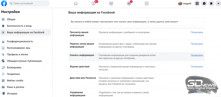 - Selecione “Suas informações no Facebook” no menu à esquerda.