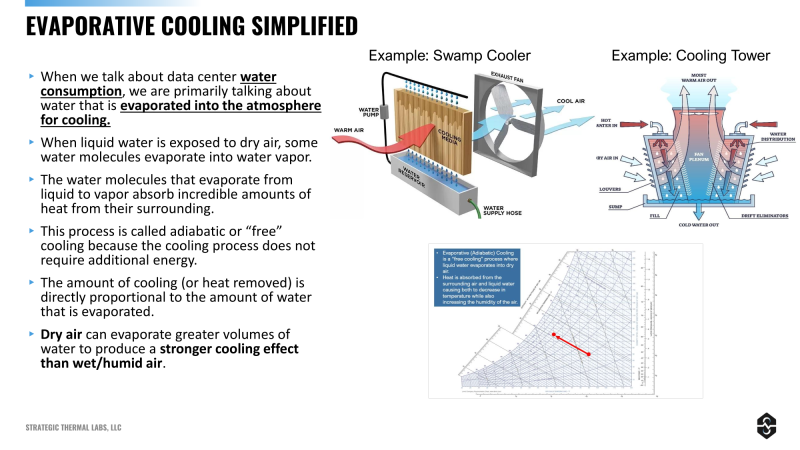 O principal culpado são os sistemas de resfriamento evaporativo, que captam água de fontes locais e a bombeiam para os equipamentos, onde ela evapora, transferindo calor para o ar. A principal razão para a popularidade dessa tecnologia entre os operadores de data centers é a alta eficiência desses sistemas e a menor necessidade de energia para resfriamento. A evaporação de aproximadamente 40 litros por minuto é suficiente para equipamentos de 1,5 MW, de acordo com o The Register, citando dados da Strategic Thermal Labs.