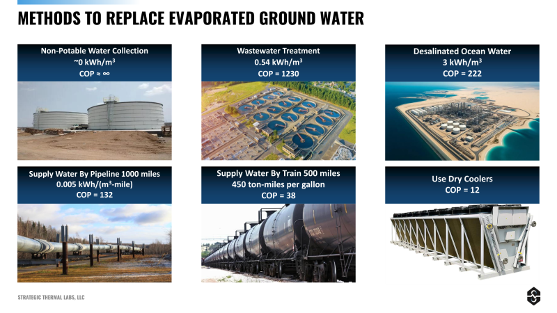 As fontes de água para data centers desempenham um papel crucial. Em algumas regiões, até mesmo a água potável é escassa. Especialistas sugerem que os operadores de data centers invistam em usinas de dessalinização, redes de distribuição de água, estações de tratamento no local e outros recursos para expandir o uso do resfriamento evaporativo. Segundo alguns cálculos, a dessalinização e o transporte costeiro de água ainda são mais eficientes do que a eliminação de sistemas de evaporação — mesmo com o uso de caminhões-tanque em vez de dutos. A Microsoft está desenvolvendo um data center com consumo de água quase nulo e já experimentou a captação de água da chuva. A AWS prometeu converter outros 100 data centers para o uso de água residual reciclada para resfriamento.