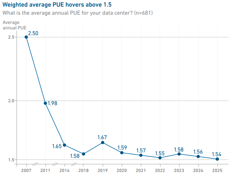 Onde o resfriamento gratuito for inviável, a transição para um sistema de resfriamento líquido (LCS) — tanto por resfriamento a seco quanto por imersão — é possível. Embora os sistemas de resfriamento a seco consumam mais energia do que os sistemas de resfriamento evaporativo, a melhoria no PUE pode, em última análise, compensar a diferença. Por exemplo, a transição para resfriamento líquido direto em chips NVIDIA Blackwell pode reduzir o PUE de 1,69–1,44 para 1,1 ou menos. No entanto, o equilíbrio depende de muitos fatores. A própria NVIDIA ainda não está preparada para sistemas de resfriamento líquido imersivos, e a média global de PUE não mudou muito ao longo dos anos.