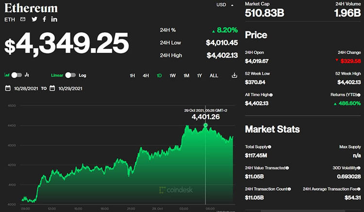 Ethereum, a segunda maior criptomoeda do mundo, atingiu um recorde histórico na sexta-feira. Seu valor subiu 2,6%, para US $ 4.400, superando o recorde anterior de US $ 4.380 estabelecido em 12 de maio. Isso aconteceu mais de uma semana depois que o Bitcoin estabeleceu seu próprio recorde de $ 67.016.