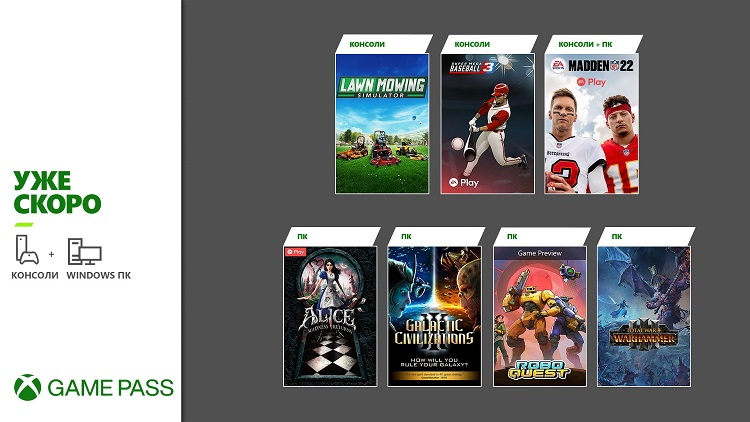 Já em 17 de fevereiro, o simulador de corte de grama Lawn Mowing Simulator aparecerá no Xbox Game Pass, a estratégia Total War: Warhammer III aparecerá no PC Game Pass e o simulador de futebol americano Madden NFL 22 estará disponível nas duas versões do serviço (e EA Play).