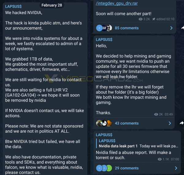 O grupo de hackers LAPSUS$ alega ter tido acesso aos servidores internos da NVIDIA por uma semana e roubou 1TB de informações confidenciais de lá. De acordo com os invasores, apesar de todos os esforços do fabricante da GPU, eles conseguiram acesso a dados sobre drivers gráficos NVIDIA, outros softwares e documentação de diversos produtos do fabricante.