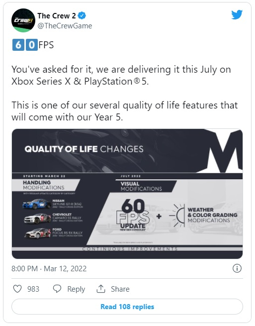 A atualização de julho para The Crew 2 também adicionará novos efeitos climáticos ao arcade de corrida e melhorará o sistema de iluminação. A data exata de lançamento da atualização não foi nomeada, mais informações aparecerão mais perto do verão.