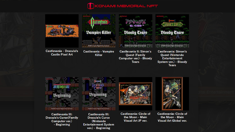 A Konami já publicou todos os 14 NFTs do conjunto. Um dos itens da coleção foi a pixel art original do mapa do castelo de Drácula. Esta ilustração mostra locais e monstros do Castlevania original. A composição musical de Vampire Killer do primeiro nível é apresentada no formato de um vídeo com cenas do jogo. A coleção também inclui um vídeo de gameplay que apresenta a história do caçador de vampiros Simon Balmont.