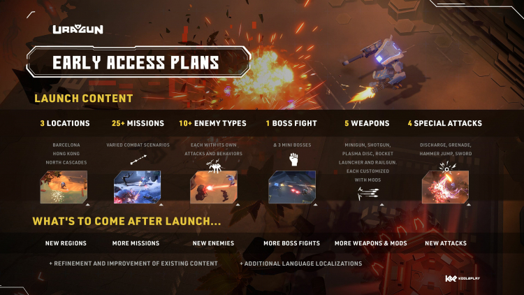 No lançamento do acesso antecipado, Uragun custará US$ 15 e oferecerá três locais (Barcelona, Hong Kong, North Cascades), 25 missões, mais de 10 tipos de inimigos, um chefe, cinco armas (cada uma terá 3-5 modificações) e quatro ataques especiais.