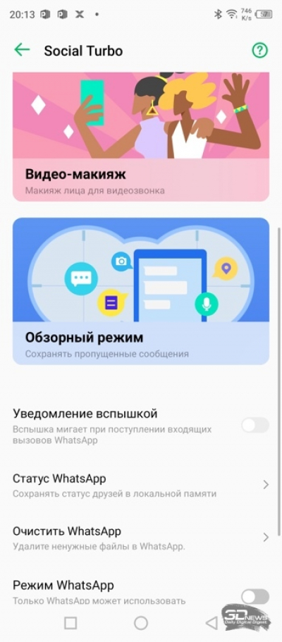 Turbo Social. Um conjunto especial de ferramentas para trabalhar com o Whatsapp: você pode configurar uma notificação em flash quando as chamadas são recebidas, gravar uma conversa com um interlocutor (e ele não saberá que uma gravação está em andamento), mudar o rosto durante uma chamada de vídeo usando o painel “maquiagem de vídeo”, altere a voz e o modo de visão geral permite que você veja mensagens recolhidas e leia mensagens sem enviar uma confirmação de leitura. Observe que a função de gravação de chamadas sem notificação ao interlocutor e a notificação de luz usando o flash também podem ser configuradas para comunicações móveis convencionais.