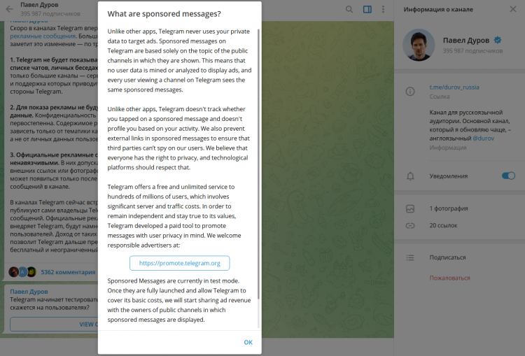 No final do mês passado, o idealizador do Telegram, Pavel Durov, anunciou que em breve estarão no Telegram blocos com publicidade oficial. Durov disse então que a maioria dos usuários provavelmente nem notará a inovação. Mas ainda assim percebemos: hoje um post de propaganda de teste publicitário apareceu no mesmo canal oficial do Durov.