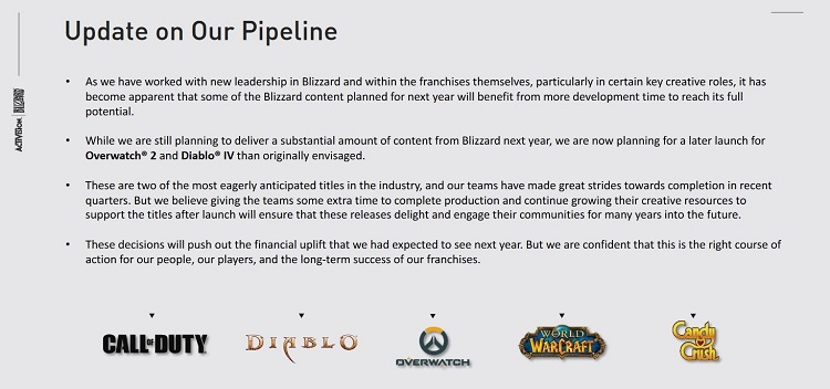 Como observou a Activision Blizzard, Overwatch 2 e Diablo IV são alguns dos jogos mais quentes da indústria, e o tempo extra da equipe garante que “esses lançamentos irão encantar e envolver suas comunidades nos próximos anos.”