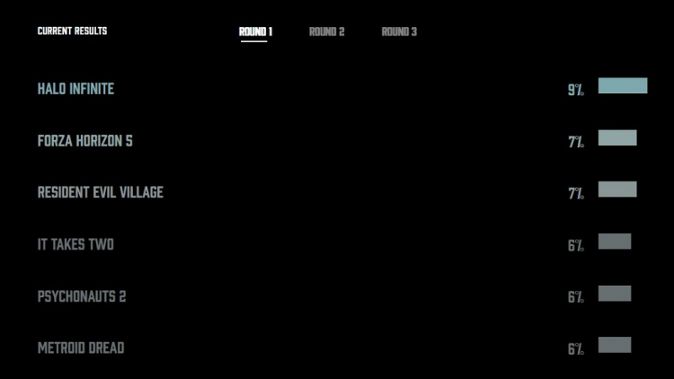 No momento da publicação do material faltam pouco menos de dois dias para o final da primeira fase. Exclusivos da Microsoft tornaram-se líderes – Halo Infinite (9%) e Forza Horizon 5 (7%), que ainda não foram lançados, junto com Resident Evil Village (7%).