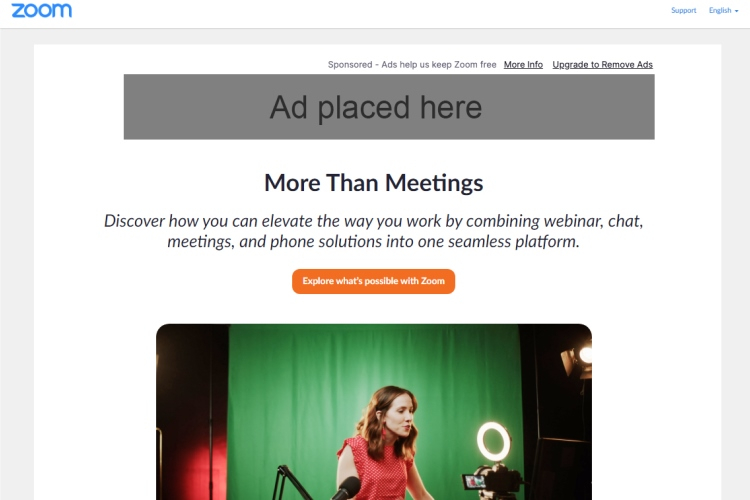 A diretora de marketing da Zoom, Janine Pelosi, disse que a empresa é forçada a começar a exibir anúncios para continuar a fornecer acesso gratuito a todos e a desenvolver a plataforma. Observe que a Zoom não usará o conteúdo de videoconferências, webinars e reuniões para fins de marketing.