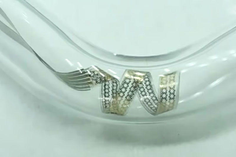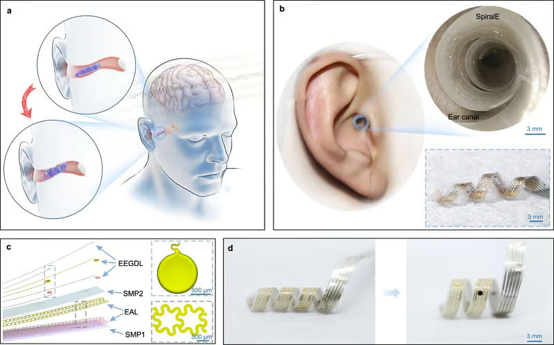 Desenvolvido por um grupo de cientistas da Universidade Chinesa de Tsinghua, o dispositivo se chama SpiralE. Esta é uma tira multicamada fina de 50 mm de comprimento e 3 mm de largura. A tira consiste em duas camadas de polímero com memória de forma, uma camada de ativação eletrotérmica de forma e uma camada com sensores para a obtenção de um eletroencefalograma.