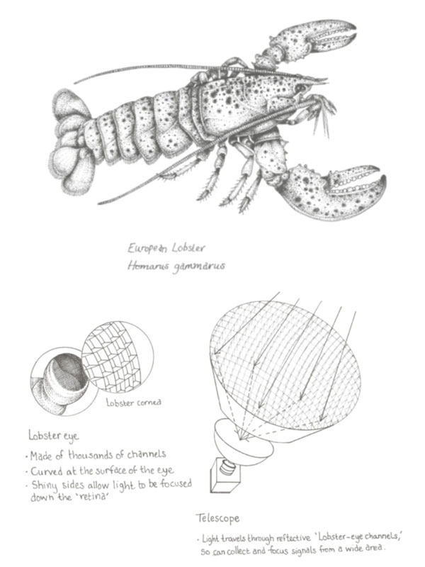 O telescópio Lobster Eye Imager for Astronomy, como o próprio nome indica, usa o princípio da estrutura do “olho de lagosta”. Nesse crustáceo e em alguns camarões, o olho é uma série de canais quadrados que convergem para uma retina redonda e sensível à luz. Isso oferece o ângulo de visão mais amplo e maior sensibilidade à luz em águas turvas. Para um telescópio de raios-X, o uso de ampliação rasante tem um significado especial, uma vez que os raios-X não são refratados por lentes comuns. É possível coletar e focar um sinal eletromagnético na faixa de raios X apenas devido à reflexão.
