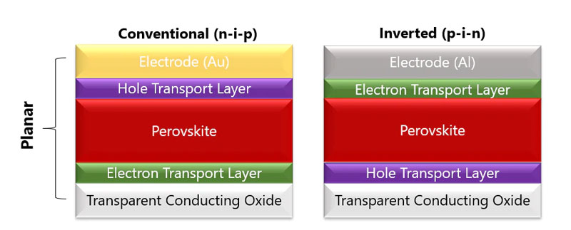 Células solares e perovskita em particular são criadas de acordo com dois esquemas principais: convencional e invertido. Estruturalmente, eles diferem na ordem de alternância das camadas semicondutoras. No caso de um circuito convencional, logo após o vidro vem uma camada condutora de elétrons, depois uma camada de perovskita e uma camada condutora de buracos por cima. No circuito invertido, a camada condutora de buracos fica primeiro no caminho da luz e a camada eletrônica fica por último.