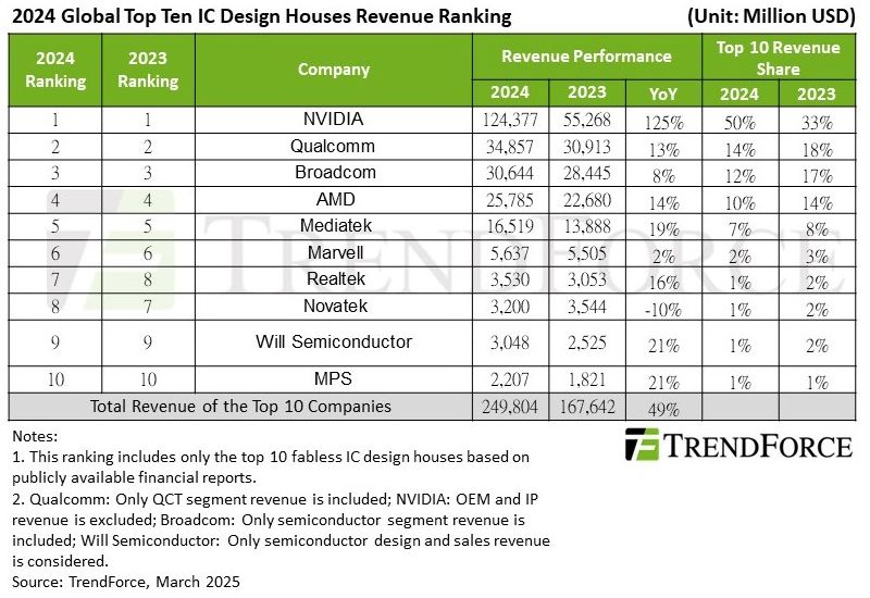 Em segundo lugar, depois da Nvidia, no ranking TrendForce está a Qualcomm, que aumentou sua receita em 13%, para US$ 34,9 bilhões, mas reduziu sua participação entre os dez maiores desenvolvedores de 18 para 14%. O progresso da Qualcomm foi ajudado pela retomada do mercado de smartphones e pela expansão da marca para o segmento automotivo no ano passado, explica a TrendForce. A Qualcomm poderá se concentrar no segmento de PCs este ano, já que suas batalhas legais com a Arm estão suspensas.