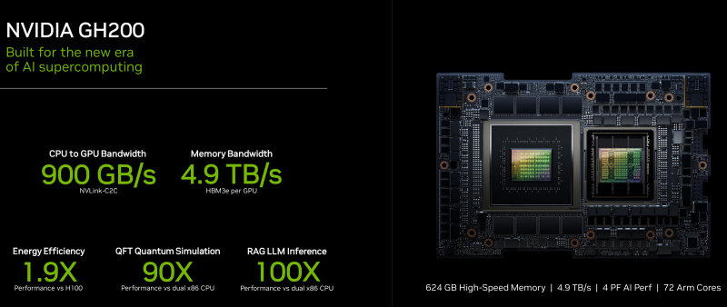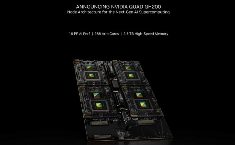 A NVIDIA também apresentou a placa Quad GH200 com quatro superchips GH200, onde todos os aceleradores são conectados entre si via NVLink em um esquema each-to-each. No total, a placa carrega mais de 2 TB de memória de alta velocidade e 288 núcleos Arm, e seu desempenho chega a 16 Pflops no FP8. Até o final do próximo ano, o desempenho total de IA dos sistemas com o GH200, segundo estimativas da NVIDIA, chegará a 200 Eflops.