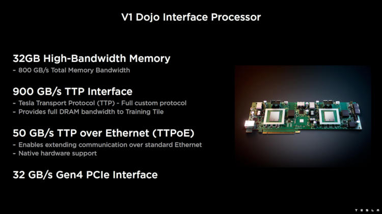 Também faz parte do Dojo o V1 Dojo Interface Processor, uma placa PCIe que responde ao trabalho bem coordenado dos bundles de Training Tile. Eles podem ser combinados em sistemas de cinco unidades e fornecem rendimento para cada Bloco de Treinamento de até 4,5 TB/s. A empresa desenvolveu sua própria interface Tesla Transport Protocol (TTP), que combina os elementos do Training Tile entre si – ele pode trabalhar via Ethernet (TTPoE) com um único espaço de endereço e um switch Ethernet padrão é adequado para o trabalho. A interface TTPoE suporta Remote Direct Memory Access (RDMA).