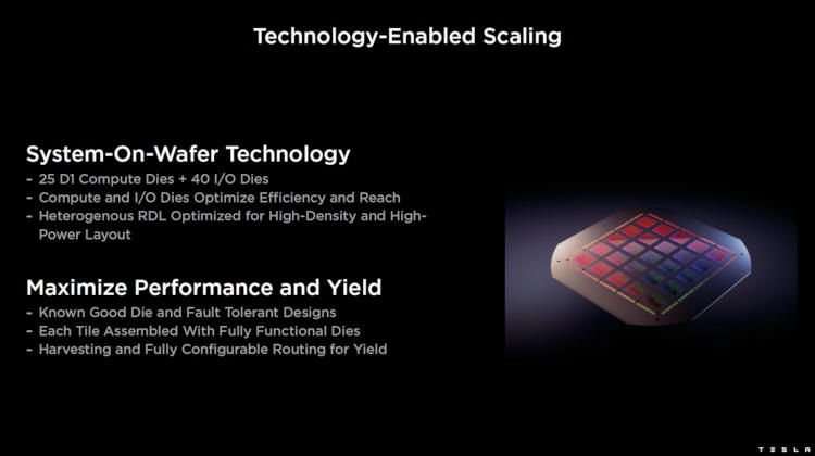 A plataforma Tesla Dojo depende do “sistema-em-wafer” (System-On-Wafer) – ou seja, o chip é um wafer de silício inteiro ou Telha de Treinamento na terminologia Tesla. Uma dessas placas acomoda 25 aceleradores D1 e 40 módulos de E/S compactos. A placa também é complementada por subsistemas de energia e refrigeração, e consome consideráveis 15 kW. O desempenho de cada Training Tile em tarefas de treinamento de IA é de 9 Pflops (BF16 / CFP8) – as placas são interligadas por um barramento com largura de canal de 9 TB/s.