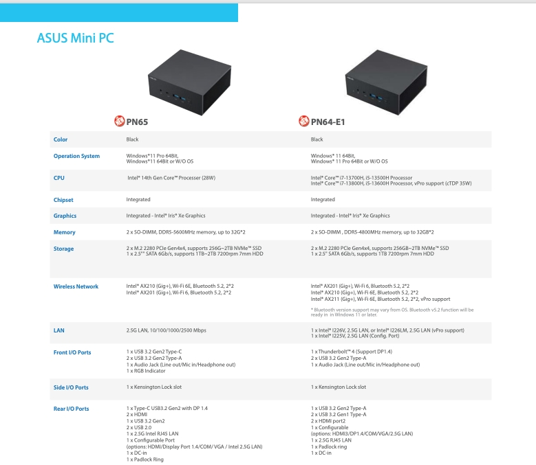 Os atuais modelos nettop ASUS ExpertCenter PN64 estão equipados com processadores móveis Raptor Lake dos modelos Core i7-13800H, Core i7-13700H, Core i5-13600H e Core i5-13500H com um TDP de 35W. Os futuros modelos ExpertCenter PN65 contarão com processadores classificados em 28W. Deve-se lembrar que os processadores móveis da Intel são representados pelos modelos H, P e U. Ainda não se sabe quais serão oferecidos como parte do ExpertCenter PN65. Ao mesmo tempo, não é necessário que estejamos falando da série Meteor Lake. Sabe-se que a Intel está implementando um novo esquema de nomeação de modelo de processador para a série Meteor Lake, e os fabricantes de PCs provavelmente já estão cientes disso. Além disso, a Intel deve lançar uma série atualizada de processadores Raptor Lake Refresh este ano, para que eles também possam ser usados nos mesmos nettops ExpertCenter PN65. Isso também é sugerido pela indicação de gráficos Intel Iris Xe integrados nas especificações dos futuros nettops ASUS, e não Arc, que será usado nos chips Meteor Lake. Embora, por enquanto, nenhuma opção possa ser descartada.