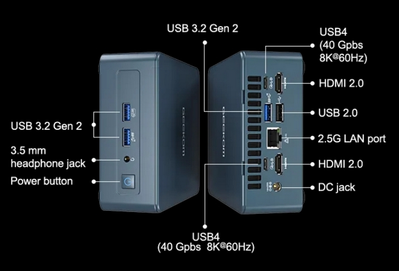 Igualmente impressionantes são as opções de conectividade do GEEKOM Mini IT12. É equipado com duas portas USB4 com velocidades de até 40 Gbps, três portas USB 3.2 Gen2, uma USB 2.0, duas saídas de vídeo HDMI 2.0, uma porta de rede Ethernet de 2,5 Gbps e um conector de áudio de 3,5 mm. O mini PC pode enviar para quatro telas ao mesmo tempo (via HDMI e USB4). Também há suporte para Wi-Fi 6E.