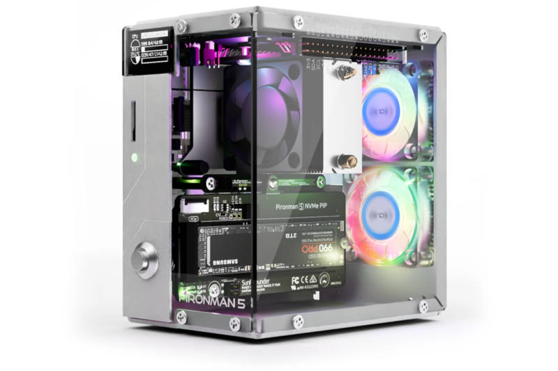 O fabricante de equipamentos educacionais SunFounder revelou o Pironman 5, um gabinete para o computador de placa única Raspberry Pi 5 que se assemelha a uma versão menor do gabinete torre para PCs de tamanho normal. Existem duas ventoinhas RGB, retroiluminação LED e a capacidade de instalar um SSD NVMe usando uma placa de expansão.