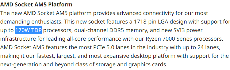 A Tom’s Hardware conseguiu novos esclarecimentos dos representantes da AMD, que, no entanto, descobriram que para a plataforma Socket AM5 o limite de TDP é de 170 W, e o valor de PPT é obtido multiplicando o TDP por 1,35, o que resulta em 230 W. É essa energia elétrica que o soquete do processador Socket AM5 é capaz de fornecer, e é precisamente essa dissipação máxima de calor que os processadores Ryzen 7000 serão capazes. Robert Hallock posteriormente teve que admitir que o TDP é de fato 170 W, e o PPT atinge 230 W. Acrescentamos que no texto do press release no site da AMD, a vinculação do valor de 170 W ao TDP estava disponível originalmente (imagem acima).