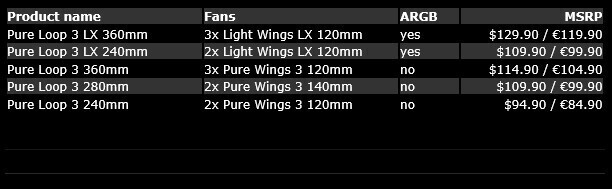 Os modelos com sistema de refrigeração líquida Pure Loop 3 utilizam ventoinhas Pure Wings 3 sem retroiluminação ARGB, com um nível de ruído máximo de no máximo 36,8 dBA. O modelo com sistema de refrigeração líquida e radiador de 280 mm é equipado com duas ventoinhas Pure Wings 3 de 140 mm. As ventoinhas do Pure Loop 3 também suportam conexão em cadeia para uma montagem mais simples e limpa. Ambas as séries de sistemas de refrigeração líquida são equipadas com um canal para adição de líquido condutor de calor.