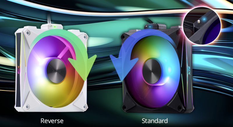 As novas ventoinhas XPG Hurricane Mag de 120 mm podem ser facilmente configuradas para aspirar ou soprar ar. Com a capacidade de mudar de direção pressionando um botão, os ventiladores XPG Hurricane Mag facilitam o gerenciamento do fluxo de ar dentro do seu gabinete.