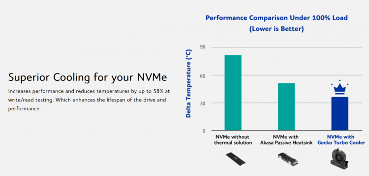 A empresa afirma que o Gecko pode mais que dobrar a temperatura operacional das unidades NVMe (em até 58%). Testes internos mostram que, mesmo sem nenhum sistema de resfriamento sob carga, a temperatura de um SSD pode subir para cerca de 80 graus, então o Gecko é capaz de reduzi-la para menos de 40 graus Celsius.