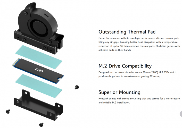 Apesar do nome, externamente a novidade parece mais um caracol do que um lagarto. O peso do refrigerador Gecko é de 120 gramas. As dimensões de um ventilador do tipo tangencial montado verticalmente (“turbina”), que faz parte do sistema de resfriamento, são 50 × 50 × 15 mm. Assim, ao instalar o Gecko em cima de um SSD, toda a estrutura ficará acima da placa-mãe em uma altura de 72,53 mm.
