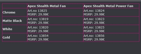 Por sua vez, a versão Apex Stealth Metal Power da ventoinha opera em velocidades de 400 a 3000 rpm. Seu consumo de energia é de 6,60 W. O ventilador produz um fluxo de ar de 116,89 pés cúbicos por minuto e uma pressão estática de 6,22 mmH2O. Arte. Seu nível máximo de ruído é de 40,2 dBA.