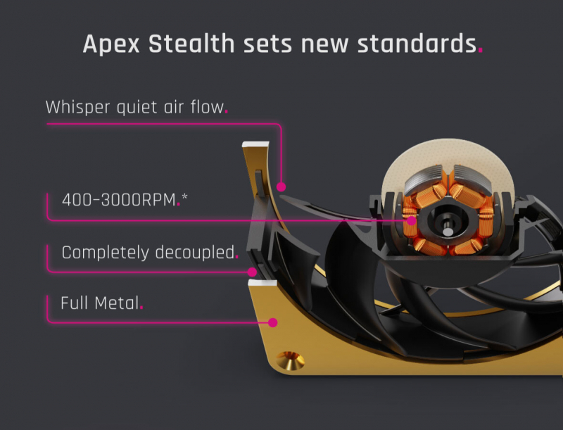 A Alphacool lançou ventoinhas de alto desempenho e silenciosas Apex Stealth Metal e Apex Stealth Metal Power com diâmetro de 120 mm. Sua principal característica é um esquema de design completamente novo e uma estrutura toda em metal.