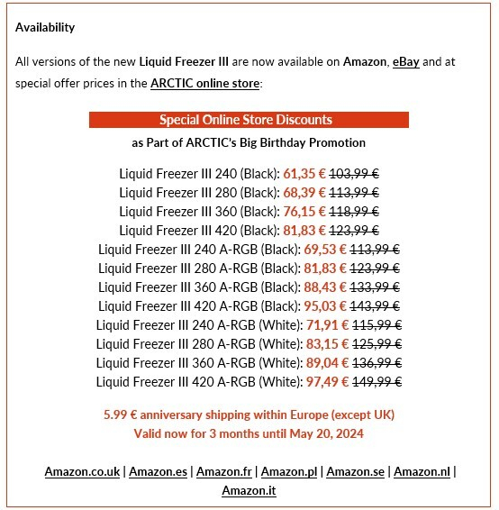 Por ocasião do próximo 23º aniversário da marca, a Arctic está oferecendo sistemas de refrigeração líquida da série Liquid Freezer III com desconto. Na Europa, novos itens estão disponíveis na loja online oficial do Ártico, bem como nas plataformas de negociação Amazon e eBay, pelos seguintes preços: