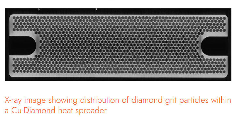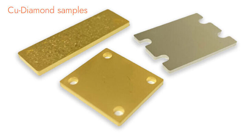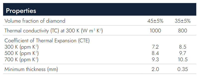 A condutividade térmica do material compósito está na faixa de 800–1000 W/mK (para comparação, a condutividade térmica do cobre é 319,5 W/mK). Além disso, o material possui um coeficiente de expansão térmica relativamente baixo, que também varia dependendo da proporção de cobre e diamantes no compósito. Os dissipadores de calor podem ser fabricados em diversos formatos e tamanhos, com possibilidade de aplicação de revestimentos de ouro ou níquel nas placas de contato, o que é necessário para determinados processos de conexão com pacotes de cavacos ou matrizes.
