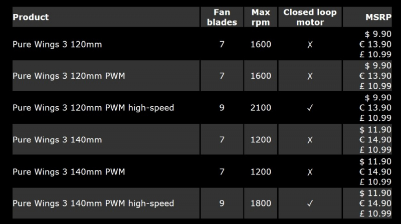 Custo de ficar quieto! fãs Pure Wings 3 custará entre 9,90 e 14,90 euros por peça dependendo da versão e tamanho. Informações mais detalhadas sobre os preços dos novos produtos podem ser encontradas na tabela abaixo.