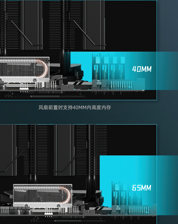As dimensões do cooler ID-Cooling FROZN A620 Black são 120 × 140 × 154 mm e o peso é de 1128 gramas. A novidade permite a utilização de módulos de RAM de até 40 mm de altura no primeiro slot DIMM da placa-mãe do sistema com a ventoinha frontal instalada. Ao instalar este último entre as torres do radiador, o cooler não cria problemas na instalação de módulos de RAM de qualquer altura (oficialmente até 65 mm).