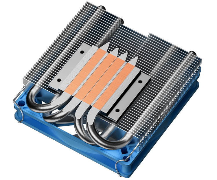 Quatro tubos de calor de cobre com um diâmetro de 6 mm passam pelo radiador de alumínio. A tecnologia Direct Touch proporciona seu contato direto com a tampa do processador.