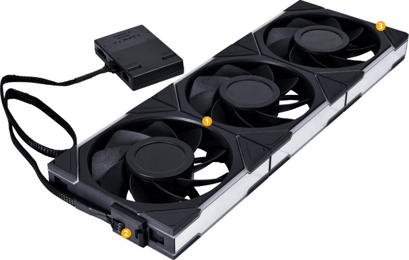 Os ventiladores LCD Lian Li UNI FAN TL e UNI FAN TL podem ser combinados em grupos de três e uma cadeia comum de sete “plataformas giratórias”. Neste caso, apenas um cabo é usado para conectar uma cadeia de sete ventoinhas ao controlador.